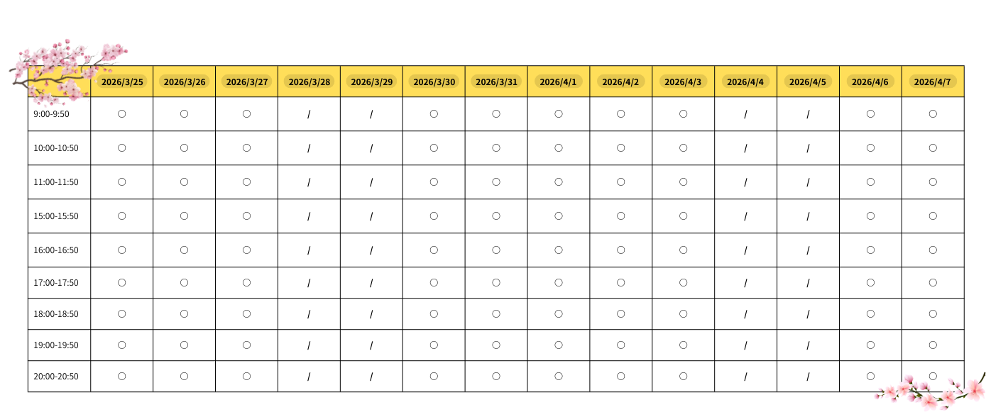 午前:9:00~9:50 10:00~10:50 11:00~11:50