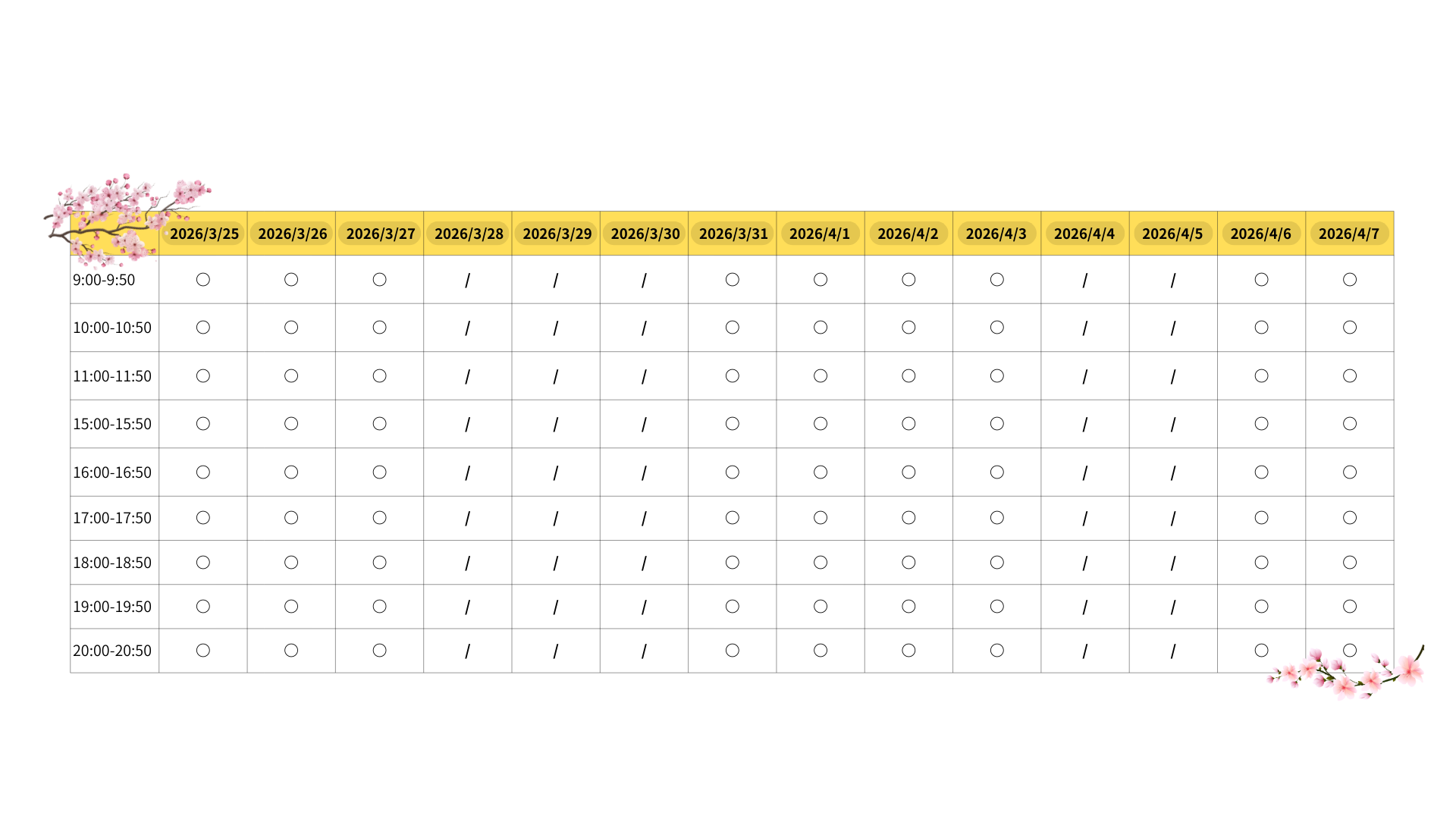 午前:9:00~9:50 10:00~10:50 11:00~11:50